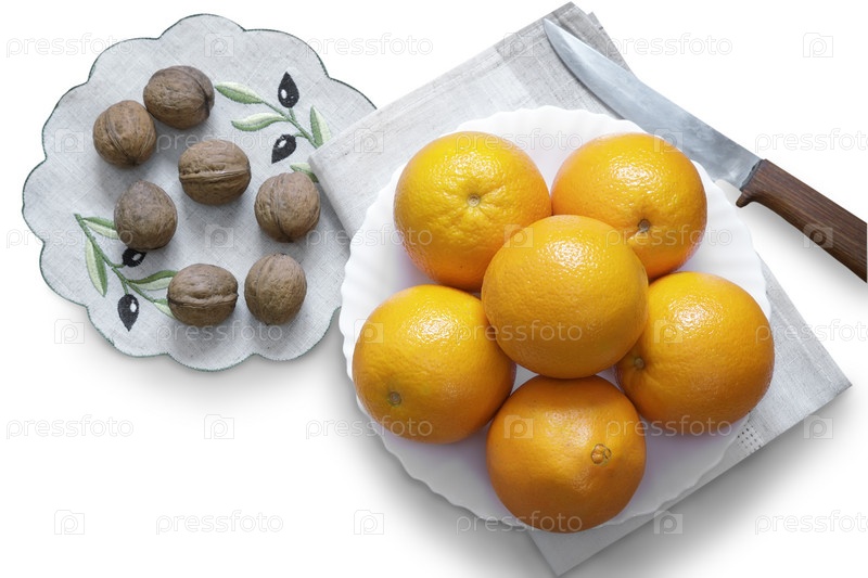 Апельсины в миске и грецкие орехи на белом фоне
