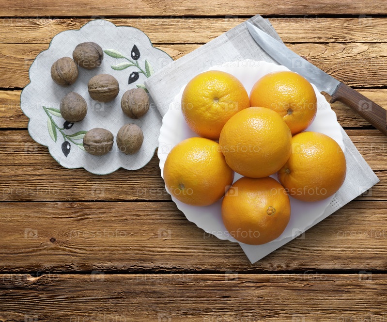 Апельсины на тарелке и грецкие орехи