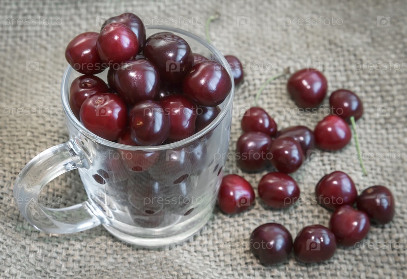 Чашка с вишнями на столе