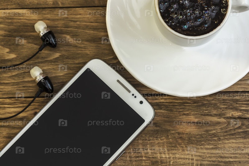 Кофе, наушники и смартфон с эквалайзером