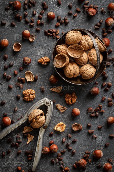 Различные орехи на каменном столе. Вид сверху
