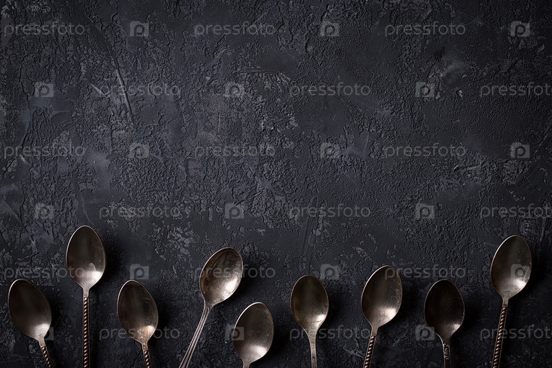 Старые старинные ложки на каменном столе. Вид сверху