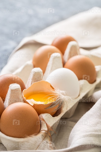 Различные яйца в картонной упаковке на темном столе