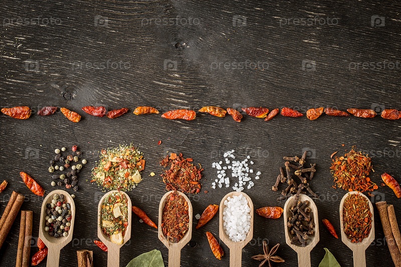 Различные специи в деревянных ложках на темном деревянном столе