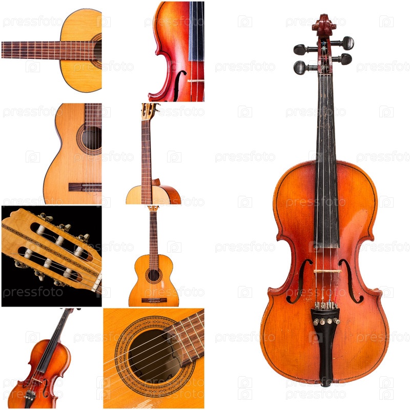 Коллаж музыкальных инструментов, гитары и скрипки