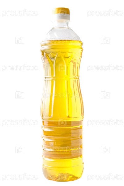 Пластиковая бутылка с подсолнечным маслом на белом фоне