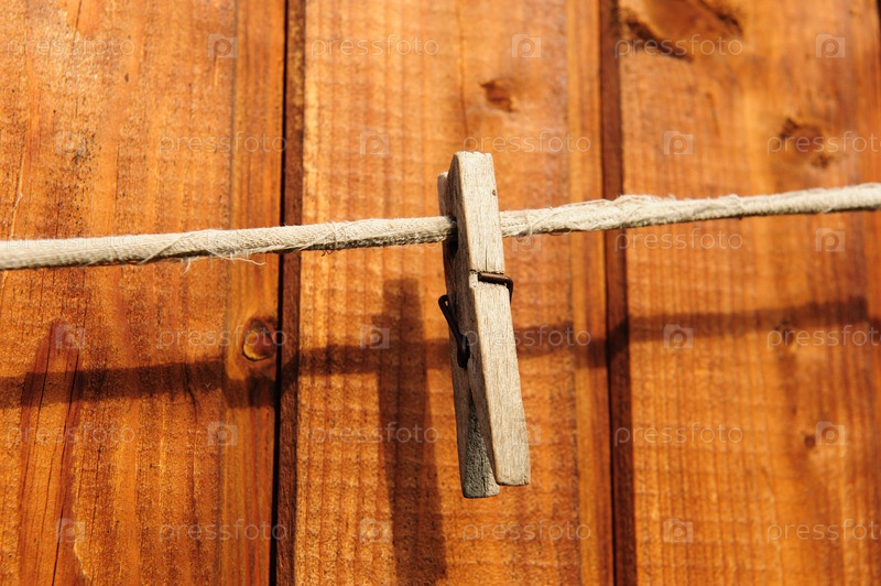 Прищепка на веревке на фоне деревянной стены