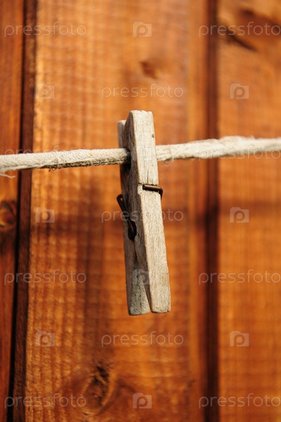 Прищепка на веревке на фоне деревянной стены