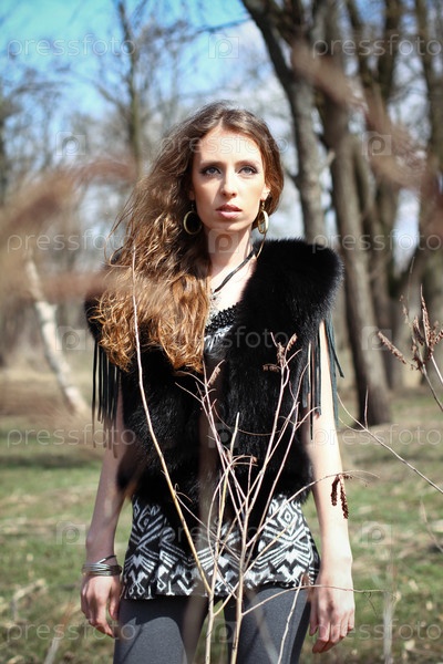 Молодая модная женщина весной или осенью в парке