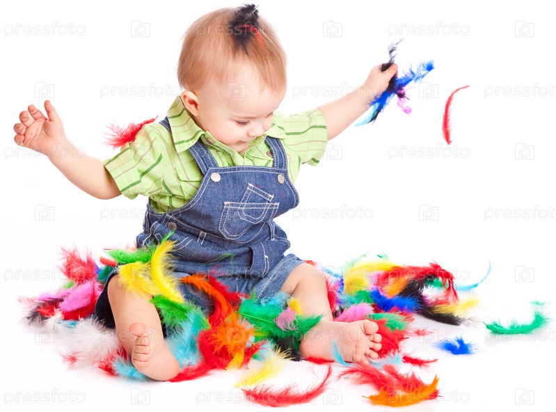 Малыш играет с разноцветными перьями