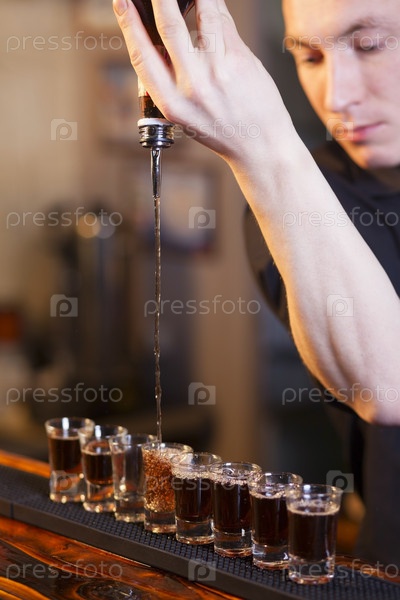Бармен наполняет несколько рюмок, стоящих в ряд
