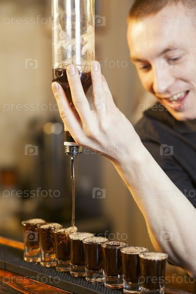 Бармен наполняет несколько рюмок, стоящих в ряд