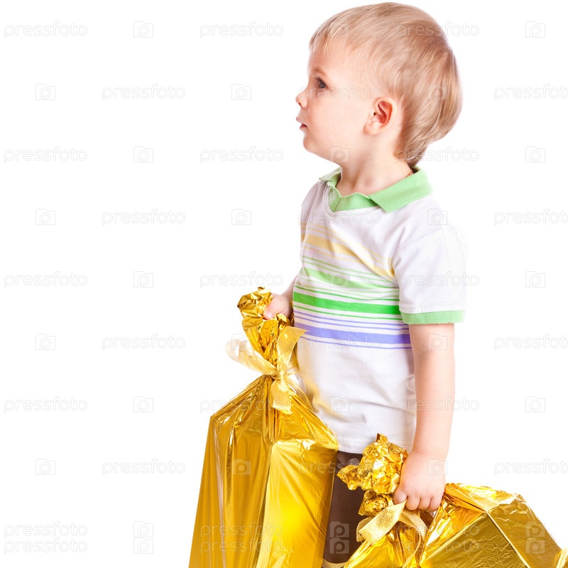 Маленький ребенок с подарками на белом фоне