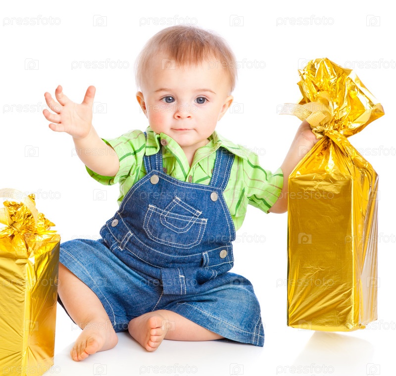 Малыш с подарками на белом фоне