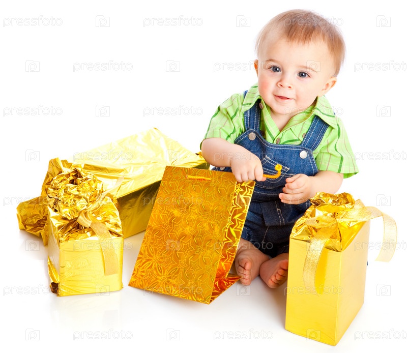 Ребенок с подарками на белом фоне