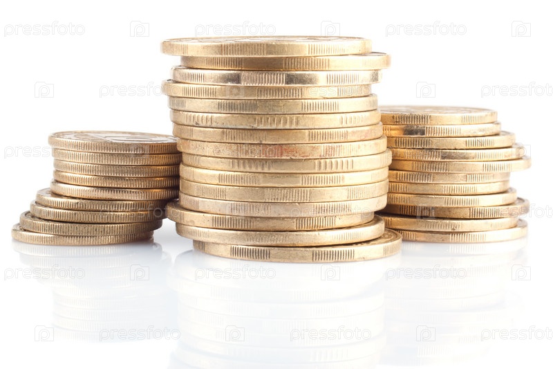Три стопки золотых монет на белом фоне
