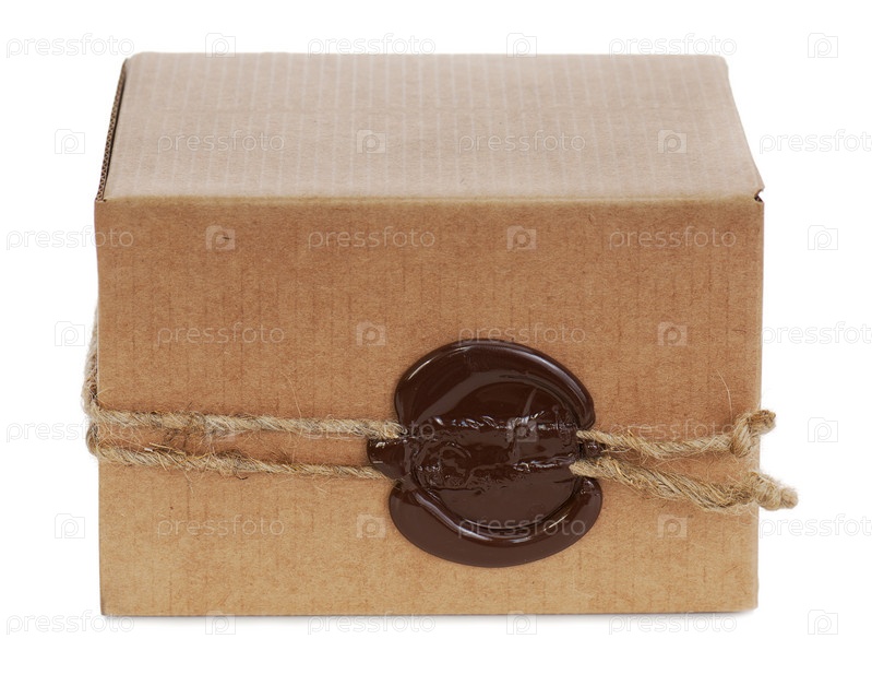 Коричневая картонная коробка с печатью, изолированная на белом фоне