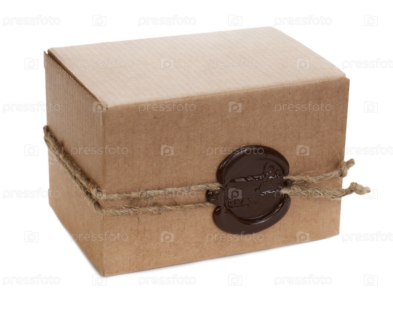 Коричневая картонная коробка с печатью, изолированная на белом фоне