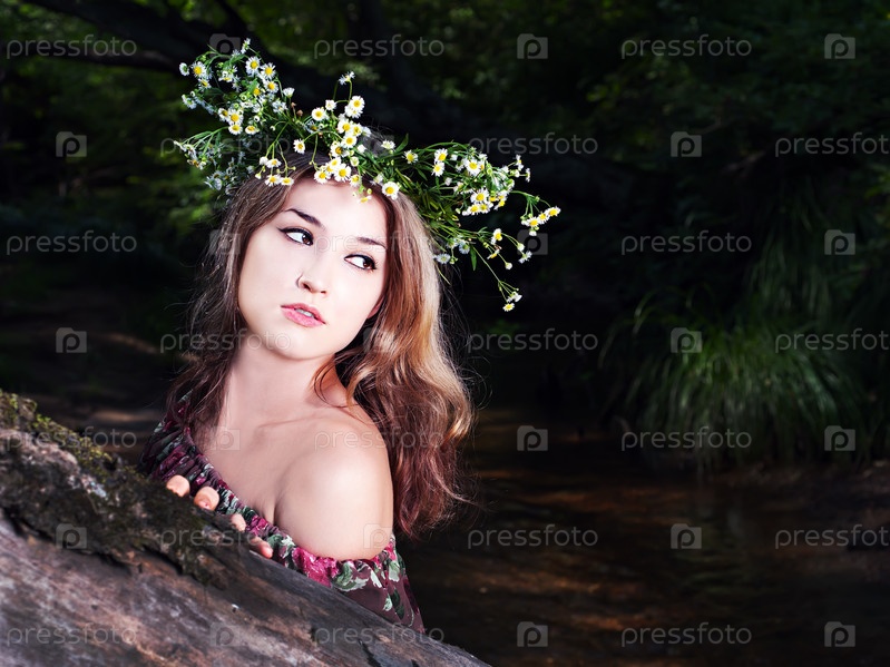 Красивая девушка в национальной одежде и венке стоит в лесу возле реки