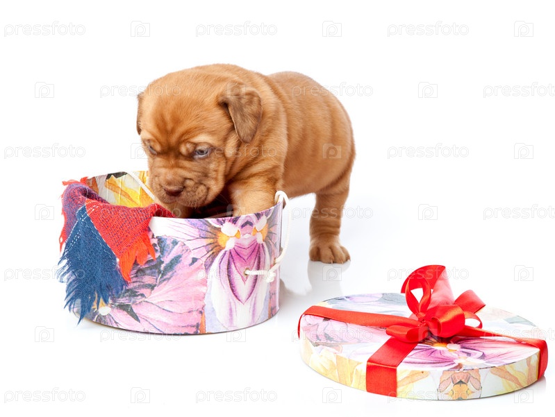 Щенок с коробкой на белом фоне