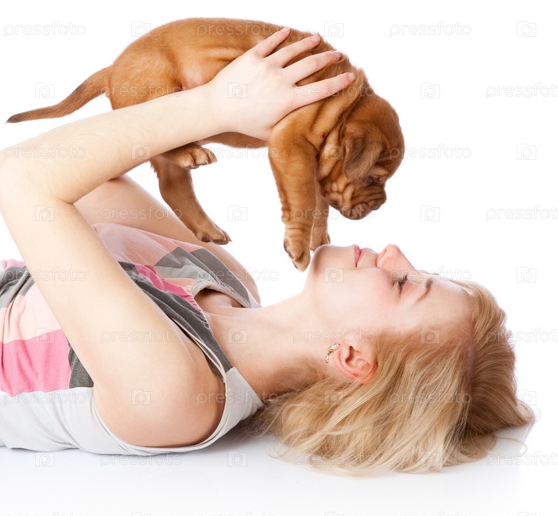 Молодая женщина с щенком на белом фоне