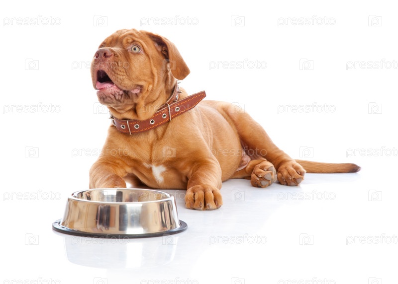 Щенок французского мастиффа лежит перед миской на белом фоне