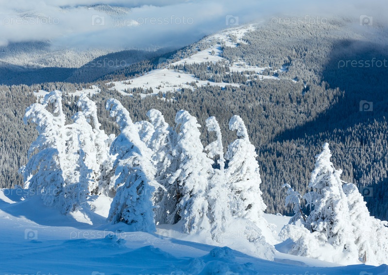 Зимний горный пейзаж с заснеженными деревьями