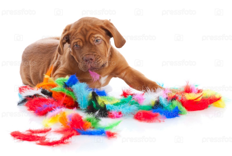 Щенок французского мастиффа на белом фоне среди разноцветных перьев
