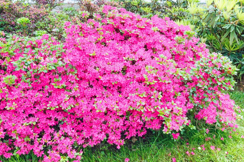 Цветущий куст рододендрона с розовыми цветами