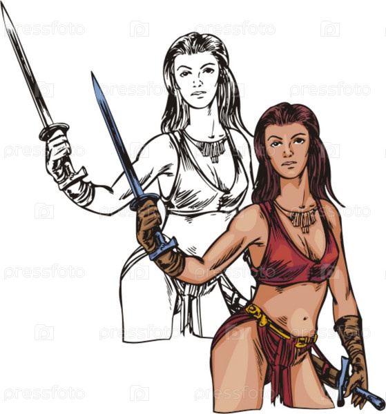 Амазонка с двумя мечами на белом фоне