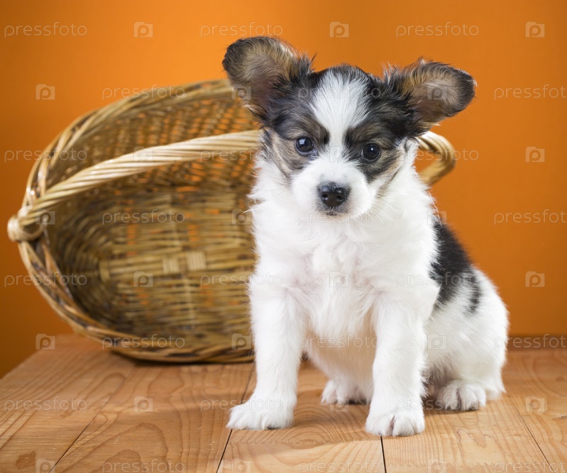 Щенок породы папильон сидит возле плетеной корзины