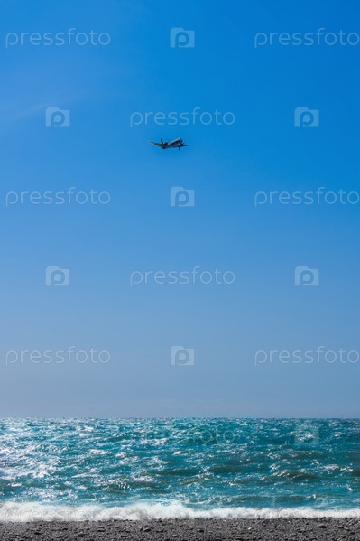 Самолет летит над морем в чистом небе