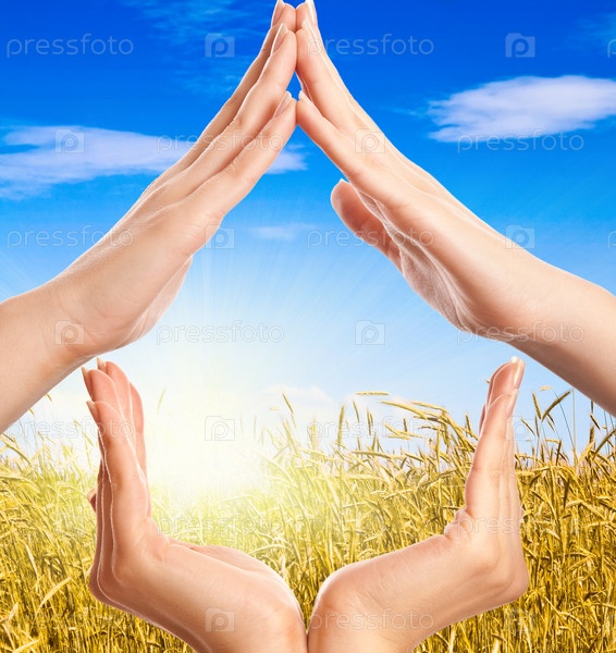 Домик, сложенный из рук на фоне пшеничного поля