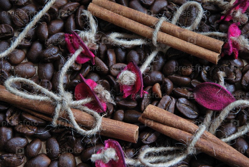 Фон из кофейных зерен, палочек корицы и лепестков роз