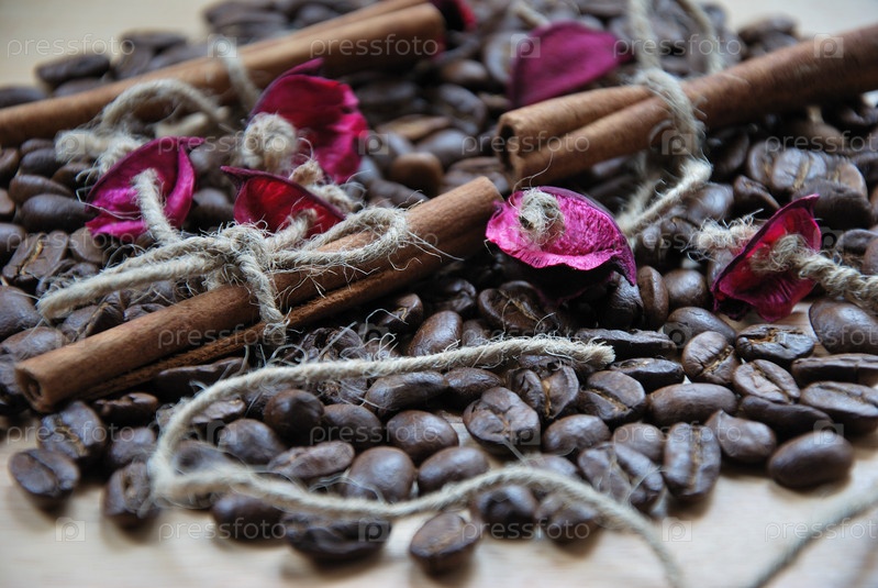 Фон из кофейных зерен, палочек корицы и лепестков роз