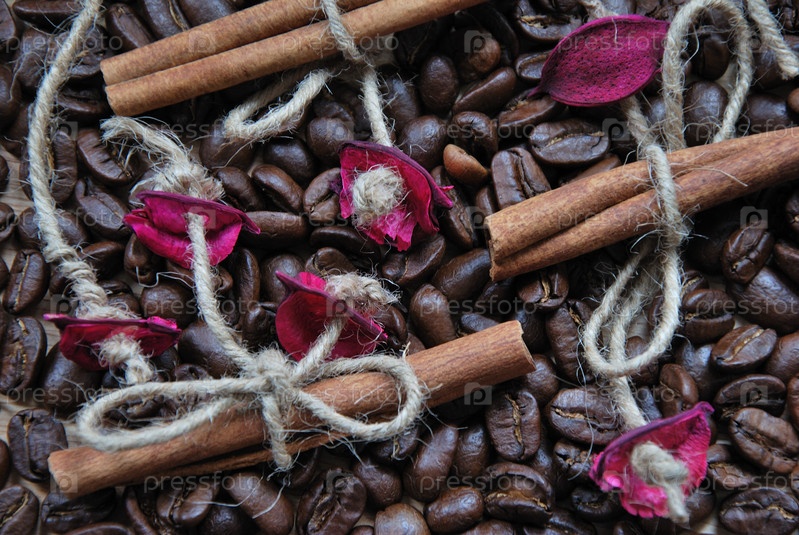 Фон из кофейных зерен, палочек корицы и лепестков роз