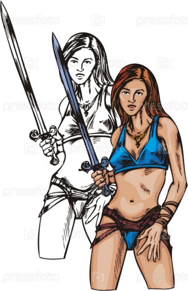 Амазонки с оружием, векторная иллюстрация на белом фоне