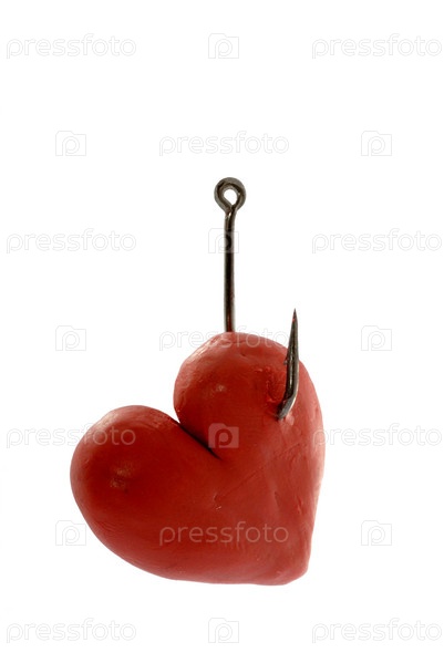 Красное сердце на крючке на белом фоне