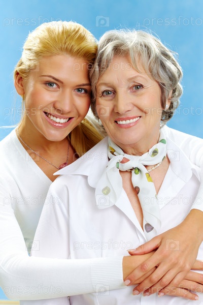 Мать и взрослая дочь на голубом фоне