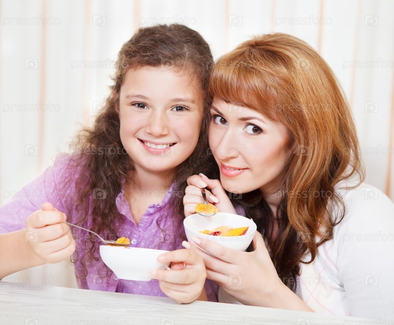 Мать и дочь едят хлопья с фруктами
