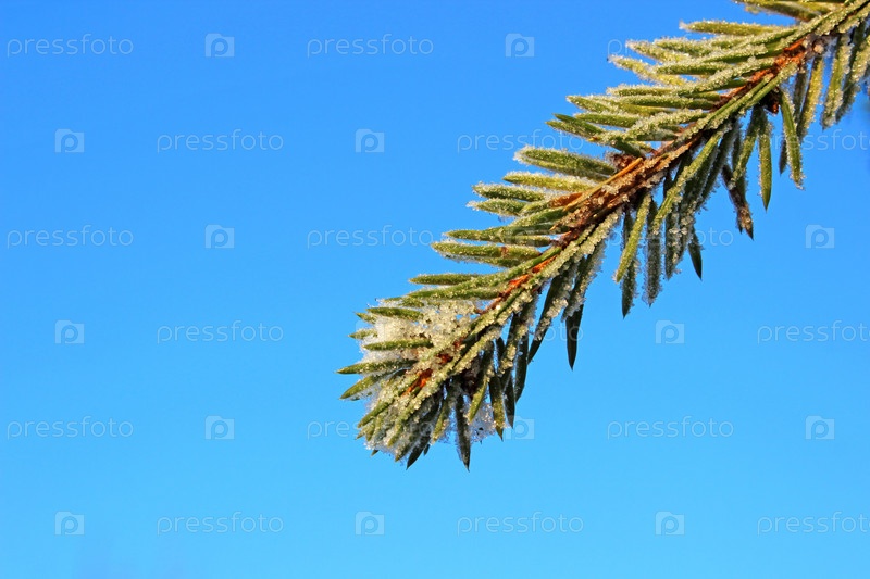 Ветка елки в инее на фоне голубого неба