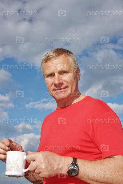 Мужчина с кружкой на фоне неба