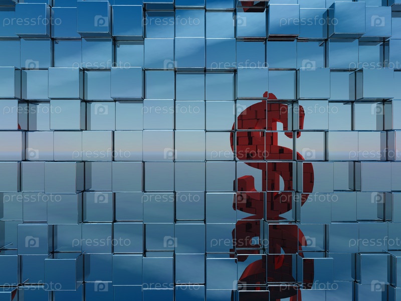 Стена из хромированных кубов отражает красный символ доллара. 3d
