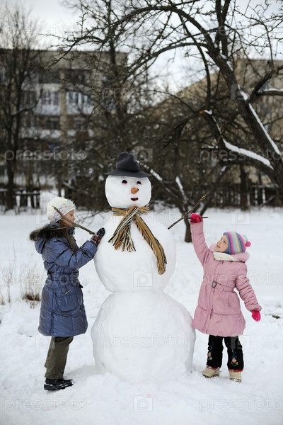 Две девочки делают большого снеговика