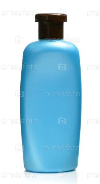 Синяя бутылка шампуня на белом фоне