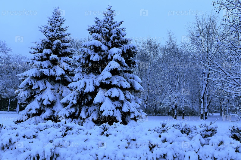 Зимний пейзаж, ель в заснеженном парке