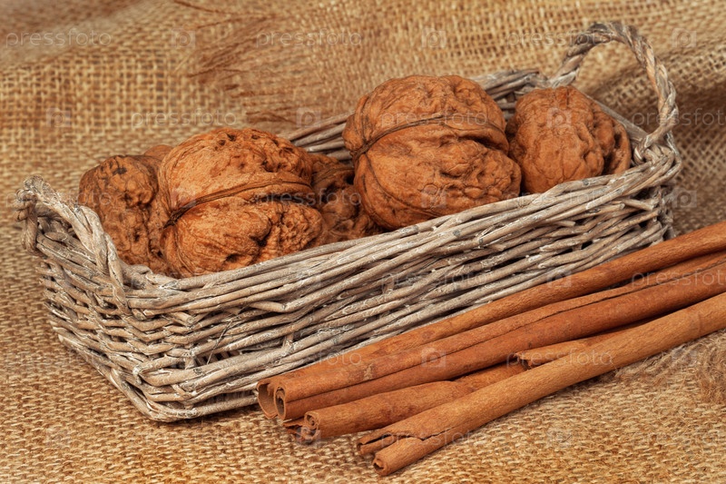 Грецкие орехи в плетеной корзинке и корица на мешковине