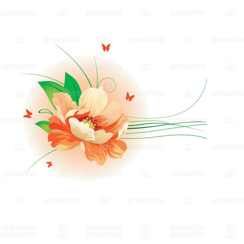 Оранжевый цветок и бабочки на белом фоне