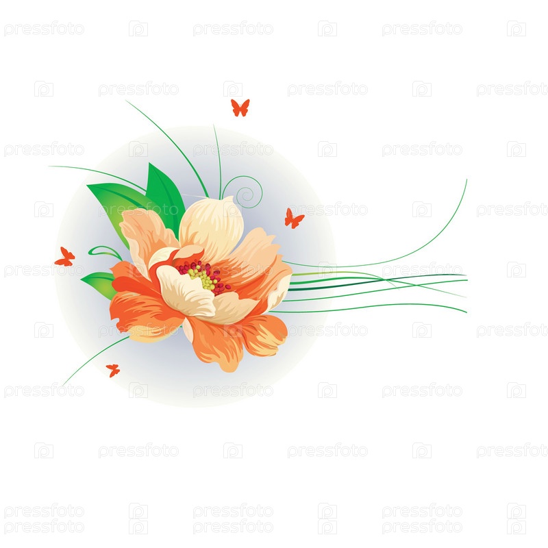 Оранжевый цветок с бабочками на белом фоне