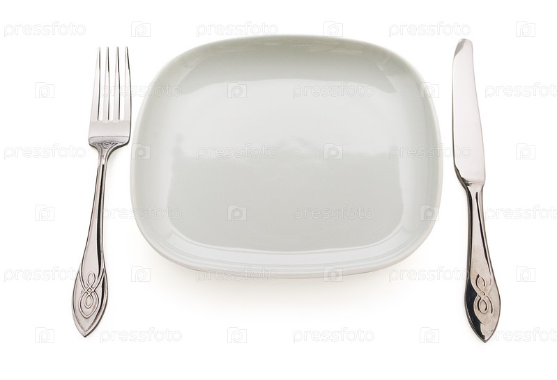 Тарелка, вилка и нож на белом фоне